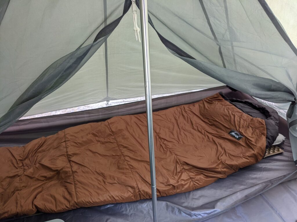 気温-3℃で暑くて靴下を脱いだ。-5℃でも快眠できたという口コミ有り。重さ、収納サイズはソロキャンプ用テントと同じぐらいの化け物級寝袋です。(笑)